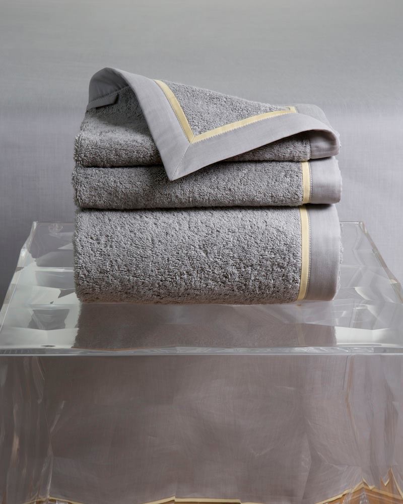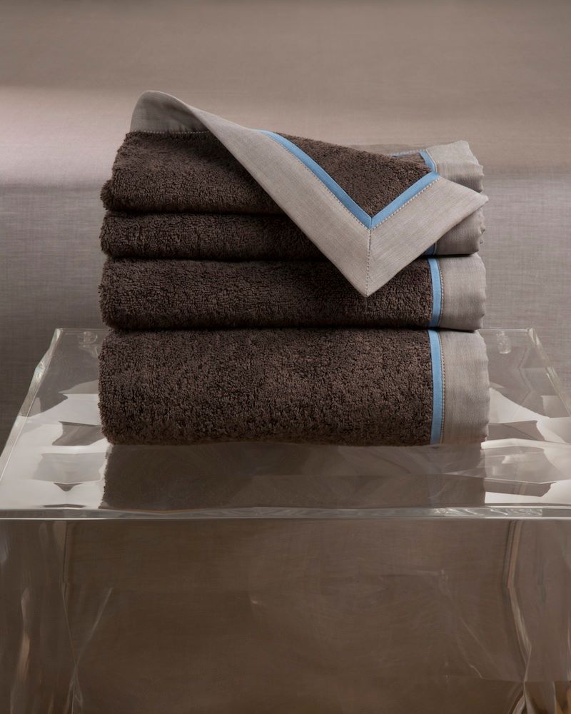Découvrez les serviettes de bain Milano le linge éponge sur-mesure ,le tissu éponge est à la fois doux et absorbant en 100% coton avec finition en biais large de même couleur, et d’un autre biais moins large d’une autre couleur.